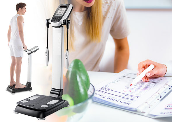 A body composition analysis using the InBody device to measure fat, muscle, water levels, and metabolic rate. It provides accurate data to help the dietitian tailor a personalized nutrition and fitness plan.